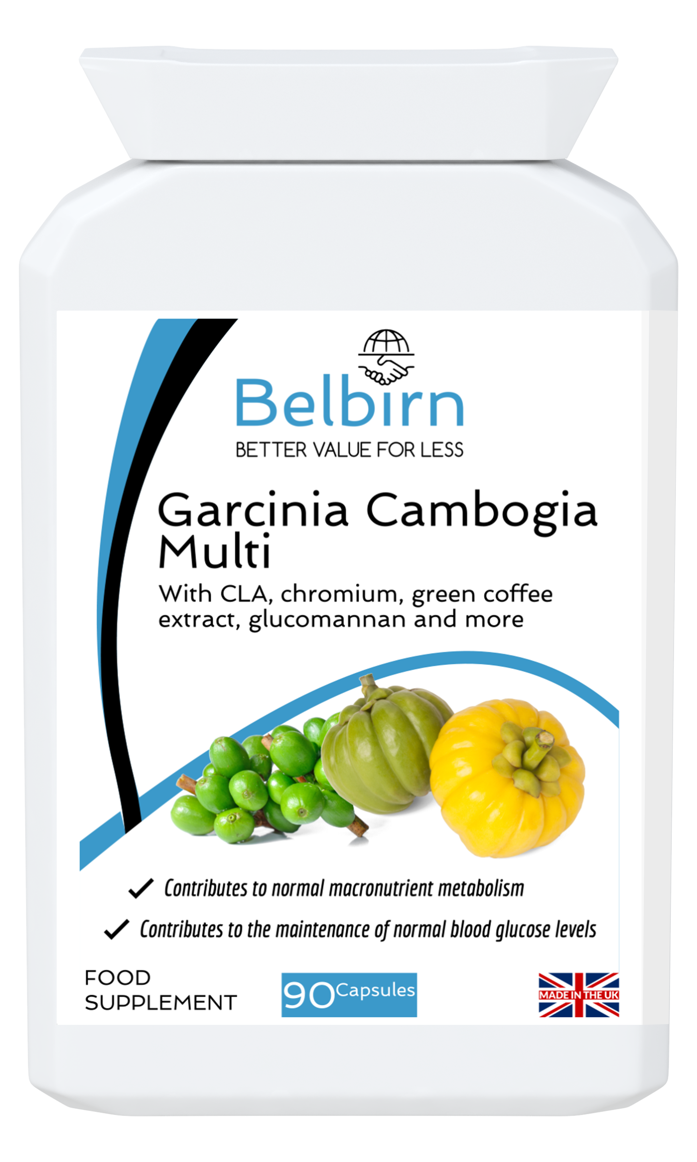 Ingredients: Garcinia Cambogia Whole Fruit Powder, Capsule: Hydroxypropyl Methylcellulose (HPMC) (Vegetarian), Glucomannan Powder, Green Coffee Extract 20:1, Bulking Agent: Microcrystalline Cellulose, Kidney Bean Extract 4:1, Conjugated Linoleic Acid (CLA), Anti-caking Agent: Magnesium Stearate (vegetable source), Cinnamon Extract 30:1, Chromium Picolinate Powder